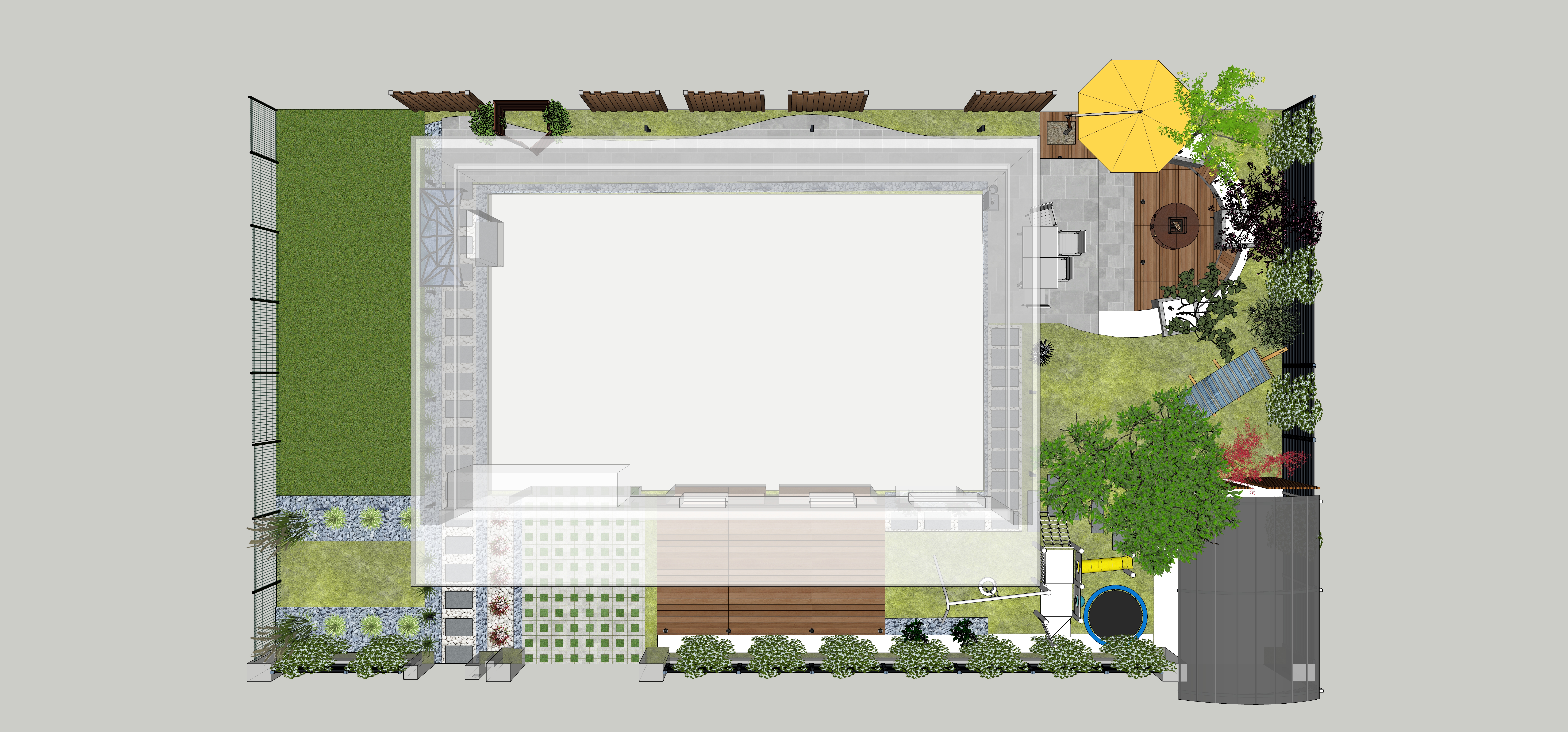 Surface détente importante avec la piscine nouvelle au centre.